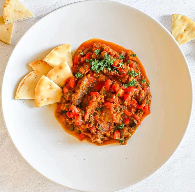 Smoked, roasted eggplant tomato dip with garlic and spices